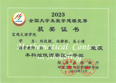 我院2021级计算机科学与技术3班张婵媛、刘孜颖,2021级人工智能1班刘柯欣、周鑫航,2021级计算机科学与技术2班代静酉五位同学在2023年全国大学生数学建模竞赛中荣获本科组陕西赛区一等奖。