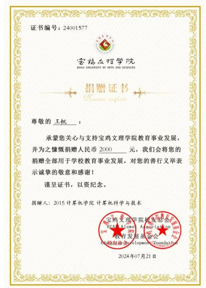 为了支持母校的抗洪清淤,孙黎副会长委托朱丽叶老师向学校教育基金会捐赠矿泉水100箱,苟树副会长委托王欢老师向学校教育基金会捐赠了防晒服50套和防晒帽50顶,两人捐赠物资合计价值5000元,用于学校防汛救灾。2015级计算机科学与技术专业的王帆校友通过基金会网站捐赠现金2000元。校友们的善举不仅体现了对母校的深厚情感,更是对学校抗洪清淤工作的实际支持,为所有校友和社会各界树立了榜样,他们的行为激励着更多的校友和社会各界人士关注和参与到抗洪清淤中来。