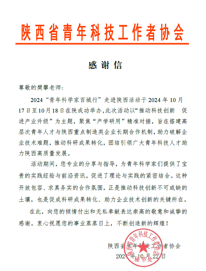 我院教师樊攀参加2024“青年科学家百城行”走进陕西活动并获感谢