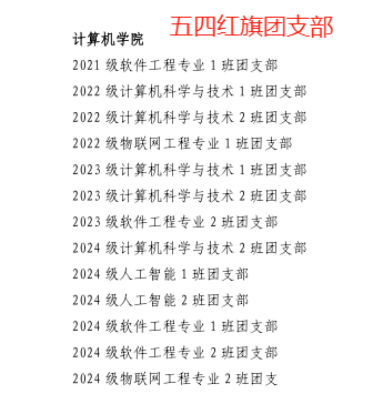 按照《关于做好2024年度“五四”评优工作的通知》(宝文理院团字〔2025〕7号)精神,通过团员教育评议、组织推荐、资格审查、述职答辩、综合评定等环节,学院参与了2024年度共青团工作先进集体和先进个人评选活动。经校团委研究决定,学院喜获“2024年度共青团单项工作先进集体”荣誉称号,2021级软件工程1班团支部等13个团支部荣获“2024年度五四红旗团支部”荣誉称号,2023级计算机科学与技术1班吴鑫源荣获“2024年度十大活力团支部书记”荣誉称号,22级人工智能2班李月阳荣获“2024年度十佳共青团员”荣誉称号,22计算机科学与技术2班周向远荣获“2024年度十佳共青团干部”荣誉称号,22计算机科学与技术2班何思源等16名同学荣获“2024年度优秀共青团干部”荣誉称号,23人工智能1班郭帅等24名同学荣获“2024年度优秀共青团员”荣誉称号。