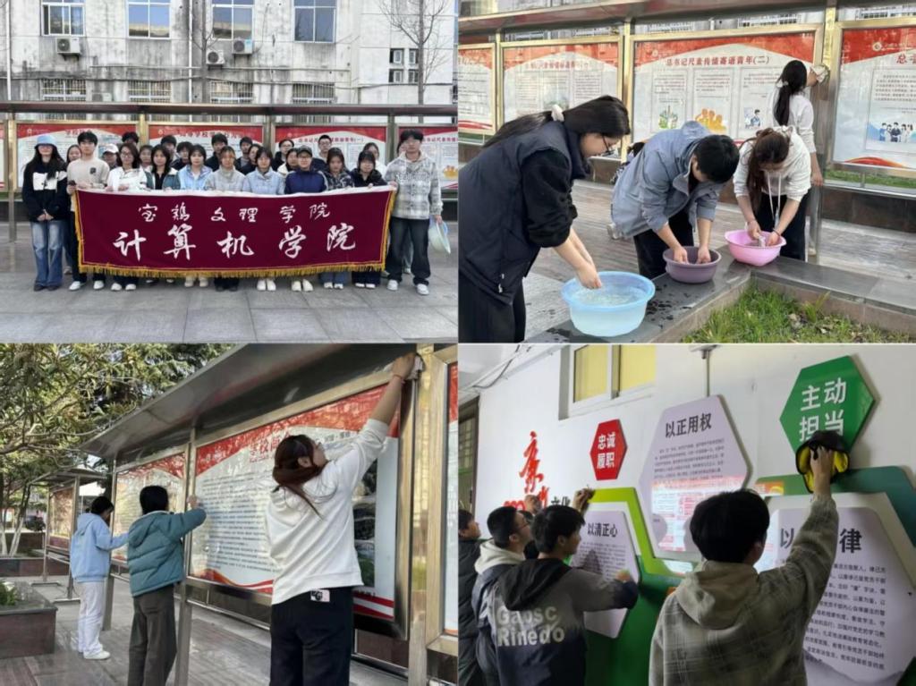 志愿者们携带抹布、水桶、清洁剂、刮板等工具准时集合,大家明确分工、有序行动。清洁过程中,大家互帮互助、团结协作,不怕脏、不怕累,以饱满的热情和认真负责的态度投入劳动。经过共同努力,各处宣传栏焕然一新,玻璃透亮、版面整洁,化身校园中播撒文明与正能量的明亮窗口。